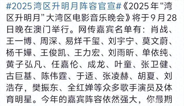 2025年“湾区升明月”晚会将于9月28日在澳门举办,和往年一样,这次依然汇集了两岸三地众多电影人、明星齐聚一堂。光是参演明星就接近百人。而这次演都有哪些让人期待的看点呢?